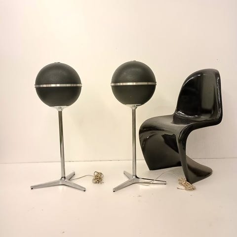 - **Suspended or Free-Standing Mounting:** Disse hyttalerne kan enten monteres i taket eller plasseres p solide kromstativer, noe som gir fleksibilitet i oppsett og plassering.