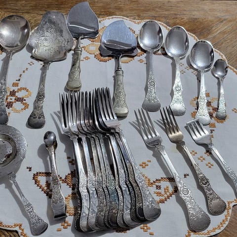 sølvbestikk, spiseskje, gafler, kniver, dessertskje, serveringsbestikk, teskjeer, kakespade, sausøse, sølvskjeer, sølvgaffel, sølvkniv, komplett sølvbestikk, sølvservise, sølvkorpus