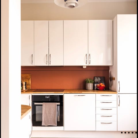Dette unike kjøkkenet kombinerer funksjonalitet, minimalistisk design og et modig uttrykk. Frontene i fargen KRONOSPAN K514 SU – en dyp, varm nyanse inspirert av teglstein – skaper en elegant og samtidig lun atmosfære.