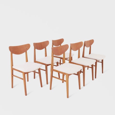 Sett av 5 spisestoler i teak fra 1960-tallet. Setene er nyomtrukket i ullstoff fra Gudbrandsdaler Uldvarefabrik. Klassisk skandinavisk stil av høy kvalitet med behagelige finish, som fremhever den organiske formen på ryggstøttene som gir stolen god komfort. I god vintage stand.