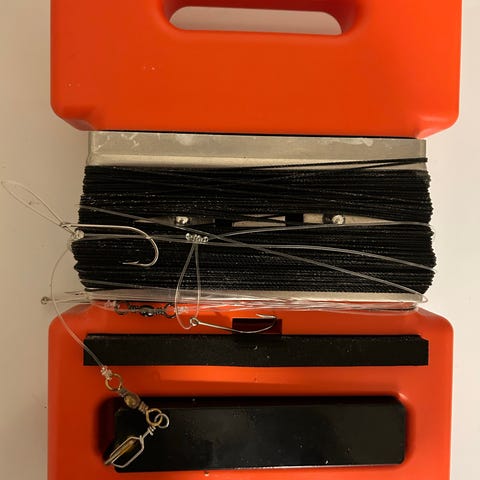 Løsne loddet, sett agn på krokene og slipp. Snøret ruller automatisk ut til loddet når bunnen og stopper. Autosett er nå oppankret og flyter — fisket er i gang!