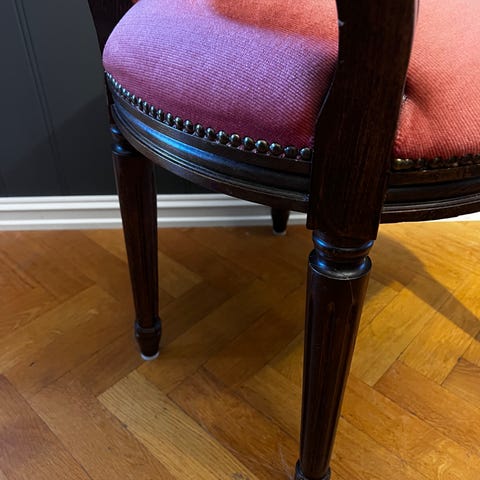2 stoler, Louis XVI stil. Rikt detaljert. Gullmalt treverk, blomstrete stoff på setene. Fra slutten av 1900 tallet.