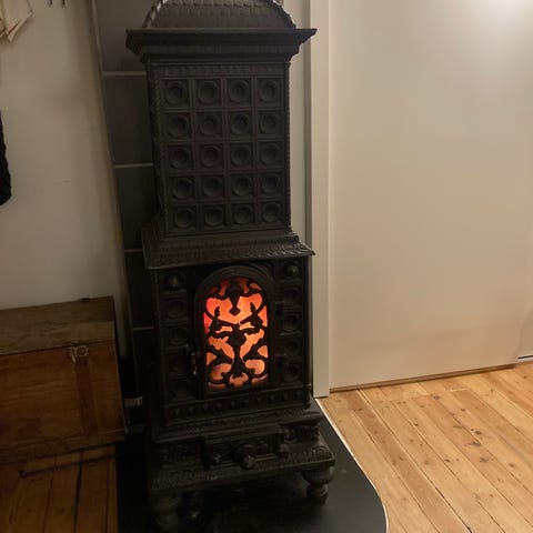 Støpejernsovn med koketopp og stekeovn.Hele toppen kan brukes til koking eller steking.