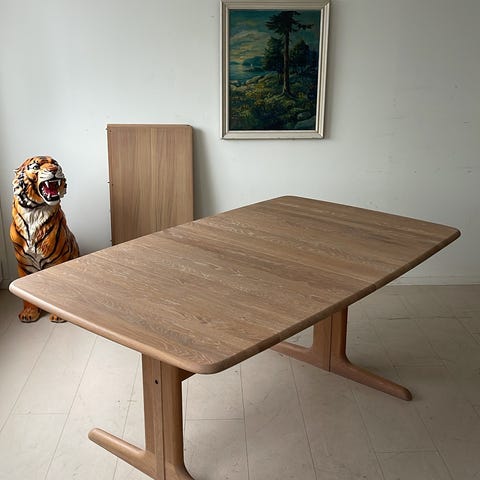 Helt rått vintage spisebord i massiv bøk for salg. Produsert ved Skovby Møbøer,, Danmark. Kommer med tre plater. Bordet er pusset ned og hvitoljet og fremstår som meget pent.