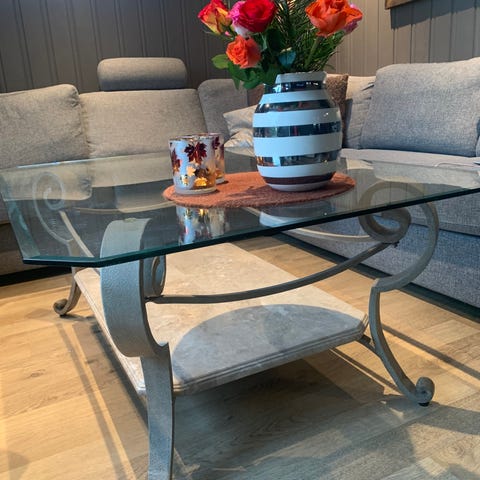 Ambassadør Glassbord 60x60cm, glass/krom - pent brukt til salgs.