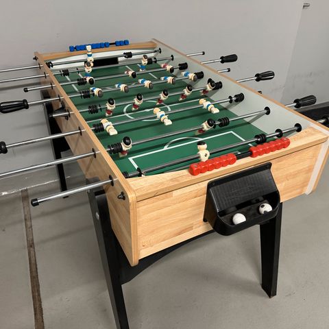 Komplett fotballsett: Dette fotballbordet kommer fullt utstyrt med alt du trenger: 2 mål, 2 fotballer, 2 resultattavler, 8 spillerstenger og 22 spillere, noe som gir en virkelig autentisk spilleopplevelse.