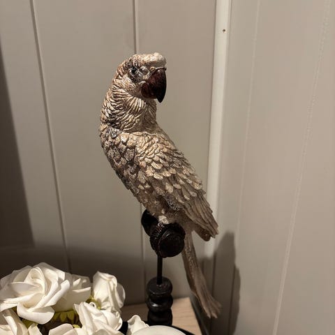 Liker du å ha litt iøynefallende interiør, bør du se på denne her (og en del andre lysestaker og lampeføtter som er i butikken). Lysestaken har en grønn fugl - kanskje en undulat eller liten papegøye og ellers går det i gull og blader. Den er hele 40 cm høy, det passer godt med kronelys i holderen og bredde og dybde er 14x13 cm. Laget i polyresin. Håndlaget i Østen. Ta mål så ser du hvor stor den er.