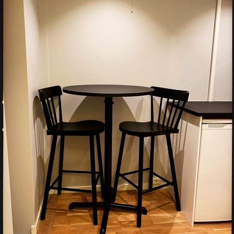 Selger et sett med bar, 2 barstoler og en barkrakk.