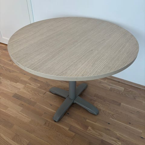 Vi har ett bord med sylinderformet sokkel - Dette er solgt. og to bord med svartlakkert understell i aluminium.