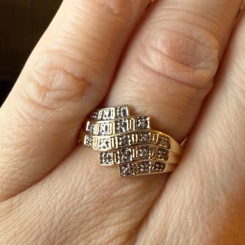 Ringen har en vakker rose i både rødt, gult og hvitt gull, med en skinnende diamant midt i rosen.