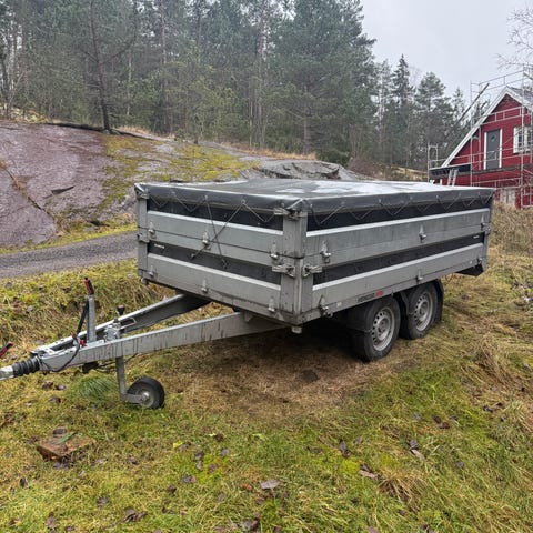 Praktisk 2-akslet varehenger fra Tysse med karmer og god lasteflate.Det er montert stålstendere i bunn for å beskytte bunnplaten ved materialtransport.