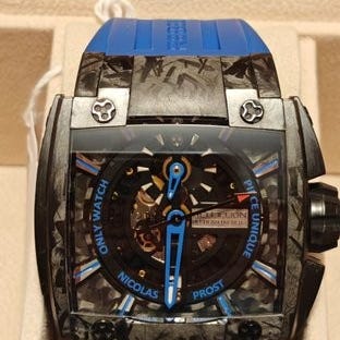 Dial: Skjelettregulatoroppsett, svart med unike bl inskripsjoner (ONLY WATCH / PIECE UNIQUE / NICOLAS PROST).