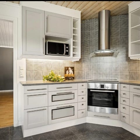 Kjøkkeninnredning i "børstet stål " selges, inklusive benkeplate , vask ( ikke blandebatteri ) koketopp 60 cm , oppvaskmaskin og ventilator.