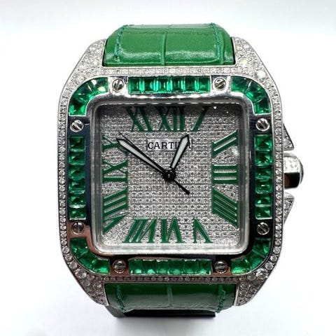 De Cartier Santos Large er en feiret klassisk modell, kjent for sitt elegante design og enestende hndverk. Diamantene p dette klokken er satt med ytterste presisjon, noe som gir en blendende effekt.
