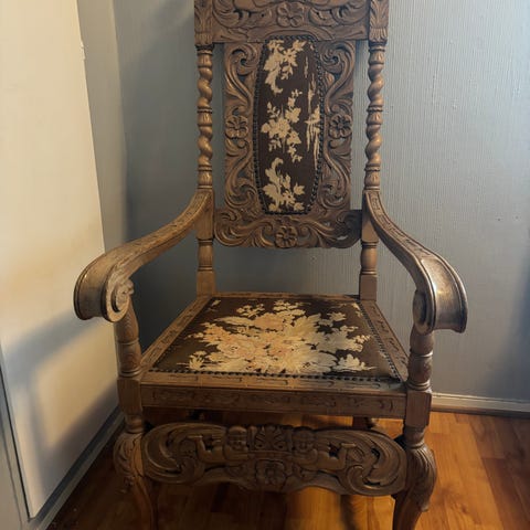Møblementet er rikt utskåret i treverket som preger hele settet.
