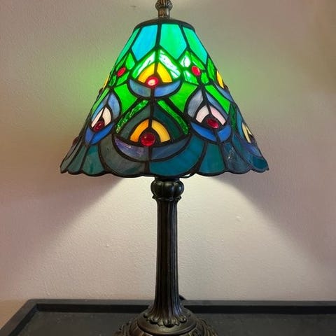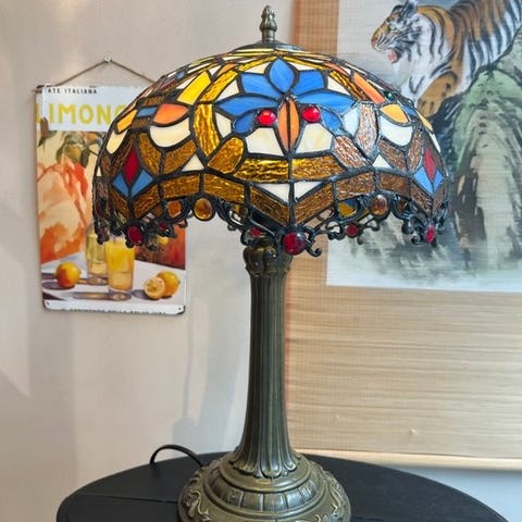 Lampskjermen er laget av farget glass og er dekorert med blomster- og bladmotiver. Lampestolpen og lampens fot er i vintage-toner. Dette utskte designet gjr dem til et populrt boligtilbehr og skaper en varm vintage-stemning.