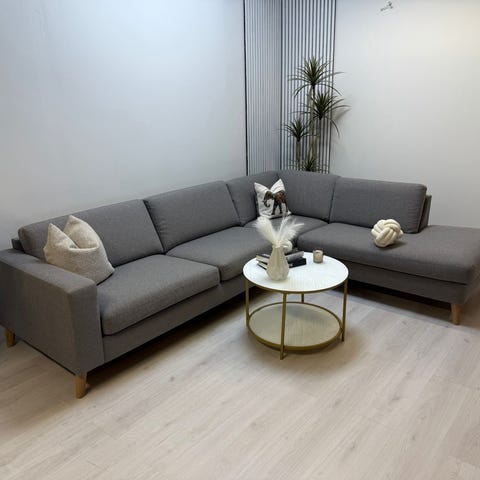 Bolia Scandinavia 3.5 pers sofa med sjeselong på høyre side sett forfra. Stilig grått Nantes- stoff og ben i lysoljet eik.