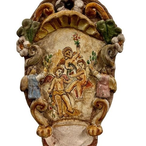 Akvarell malt for hnd. Ikonografien av San Giuseppe med Jesusbarnet representerer et betydningsfullt kunstnerisk tema, som srlig oppsto p 1600-tallet, hvor Giuseppe inntar en hovedrolle som en kjrlig farfigur, ofte avbildet mens han forsiktig holder Jesusbarnet i armene. Med 3 sm engler cherubiner, smbarn og 2 duer. Akvaretret er 23 cm bredt, 25 cm hyt og 5 cm dypt.