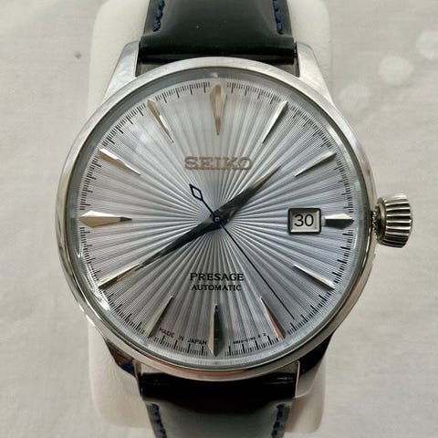 Seiko Presage, som nytt, med f eller ingen bruksspor. Glaset er krasjfritt, kassen er krasjfritt. Nytt lrsort lrreim er byttet ut p grunn av vinflekk.