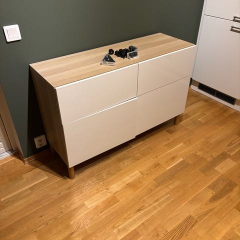 Selger et elegant underskap med fronter i linoleum i en dyp grønn farge ( CONIFER samt OLIVE på benkeplate ). Møbelet har et tidløst, eksklusivt uttrykk og har kun stått på utstilling. Veldig lite brukt og i svært god stand.