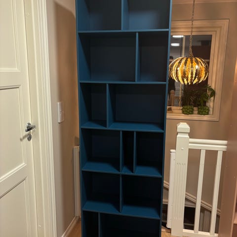 Høyt, smalt skap i linoleum kombinert med eikefiner/kryssfiner i eik.