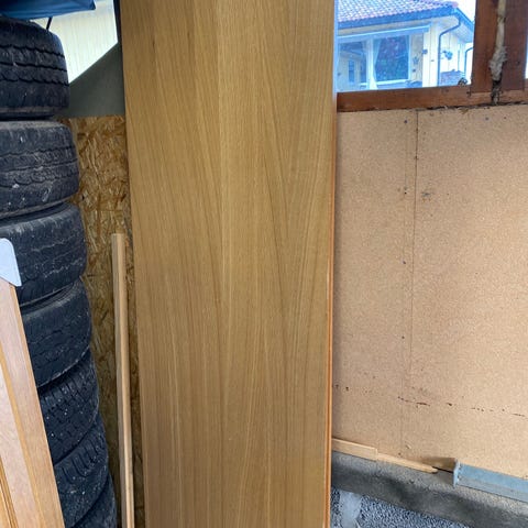 Høyt og smalt skap i linoleum kombinert med eikefiner. Et ekte designmøbel med tydelig håndverksfølelse, synlige materialkanter og et rolig, eksklusivt uttrykk. Frontene er laget individuelt – dette er et originalt og helt unikt møbel som finnes i kun ett eksemplar.