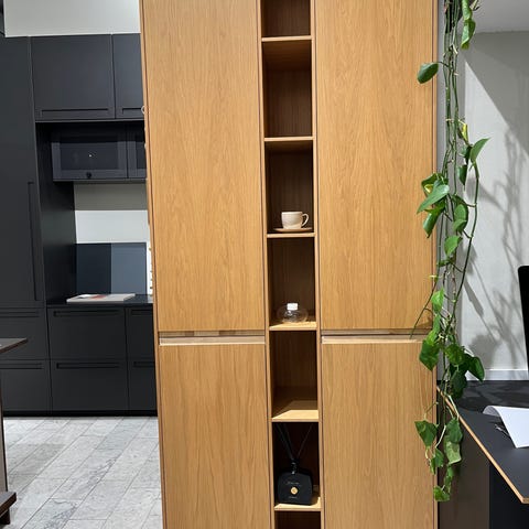 Unikt og stilrent høyskap utført i kryssfiner med eikefiner. Et gjennomført designmøbel med rene linjer, synlige materialkanter og tydelig håndverksfølelse. Skapet kombinerer lukkede fronter med åpen nisje i midten, noe som gir både praktisk oppbevaring og et elegant, arkitektonisk uttrykk.