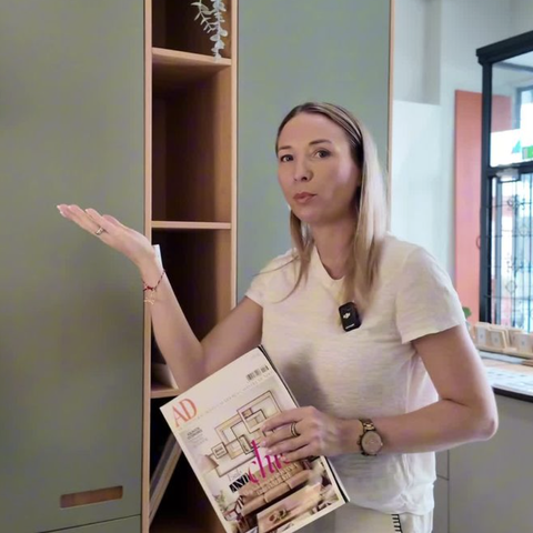Stilrent og moderne skap-/skuffesett basert på IKEA-stammer, oppgradert med eksklusive, individuelt produserte fronter i linoleum i fargen Mushroom. Treverk og detaljer er beiset i varm valnøtttone, som gir møbelet et elegant og tidløst uttrykk.