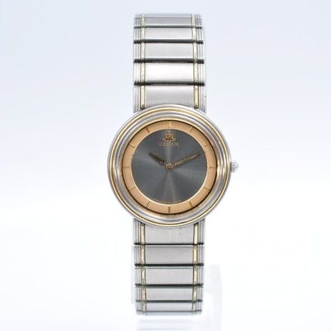 Dette quartz-uret har et dobbelt-sidet display. Den gullfargede kassen og den brune lrreimen tilfrer et snev av eleganse.