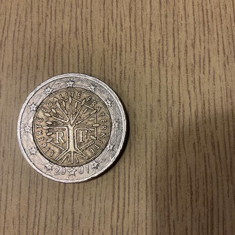 Fargerik 2-euro mynt (offisiell), svrt sjelden og vanskelig f tak i fra Frankrike.