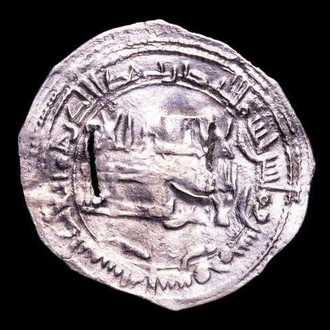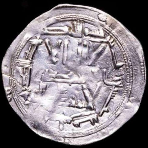 Slvdirham (2,55 g, 27 mm) preget i al-Andalus (nvrende by Crdoba i Andaluca), i ret 227 A.H. (842 e.Kr.).