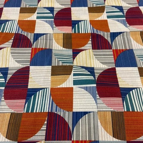 Fantastisk interirstoff i bomullsblanding, med hy vekt (veldig tung) og vakker blomster- og stripemnster i gul, bl og rd.