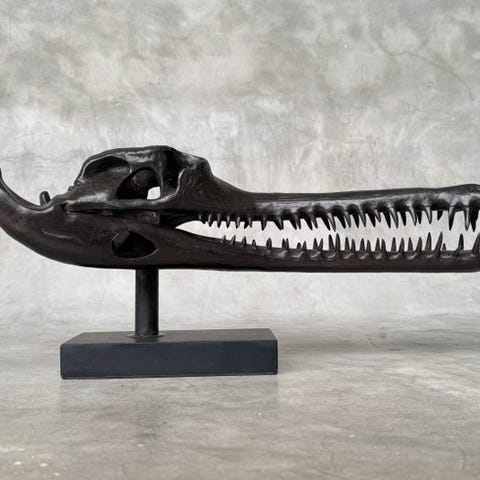 Dette er en bronse-skulptur av en Gharial krokodilleskalle. Gharialen er en fiskespisende krokodille som er hjemmehrende ved sandete ferskvanns-elvebredder i slettene p det nordlige indiske subkontinentet. I dag er utbredelsen begrenset til bare 2 % av det den en gang var. Dyret blir jaktet for medisinske forml, habitatet blir forringet, og byttet er i ferd med bli mindre. Denne skulpturen er designet av Jake Richmond, som er designer hos Sooka Interior. Skulpturen er en del av Sookas 'Eternity of Remarkable Species'-samling, hvor Sookas designere fanger den fantastiske skjnnheten til truede dyr i en statisk form. De er godt klar over den direkte pvirkningen menneskeheten har p miljet, og skaper respektfulle alternativer til de autentiske srbare artene, som Gharial krokodillen. Like fortryllende, men med mindre pvirkning.