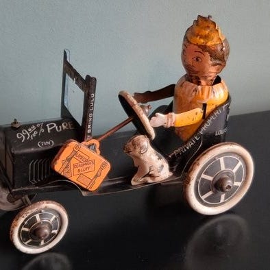 Denne Boeren Jongen er i utmerket fungerende stand. Etter oppvridning kjrer bilen en liten stund og stopper deretter for fortsette sin ferd, p riktig underlag vil gutten mtte og kunne gjre en trappende bevegelse (Lehmann-teknikk), men ofte blir han skjvet fremover av bilen.