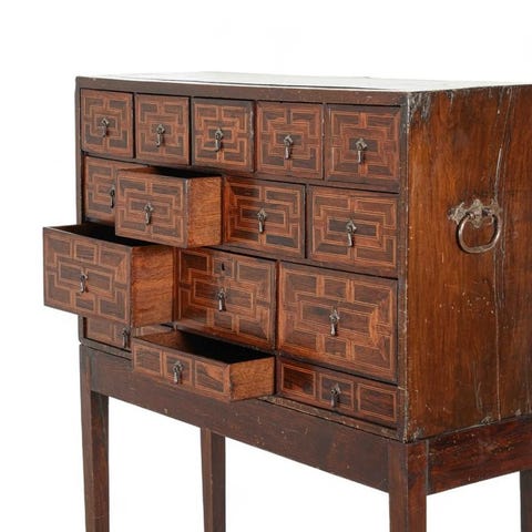 Lite oratorium i valntttre, med utskret og gjennomskret gesims med blomster- og planteornamenter, flankert av to pinakler, utskrne syler, glassdr, innvendig malt i rdt, med nkkel. Brukstegn, inaktive treborende insekter. Portugisisk produksjon, 1800-tallet.