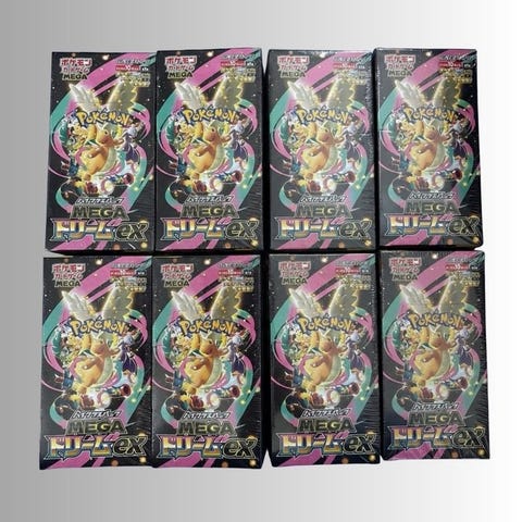 Dette oppslaget viser et sett med 8 forseglete japanske Pokmon-kortspill High-Class Pack Mega Dream EX bokser. Hver boks inneholder 10 boosterpakker, og hver pakke har 10 tilfeldig assorterte kort.