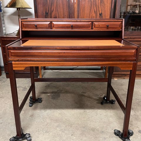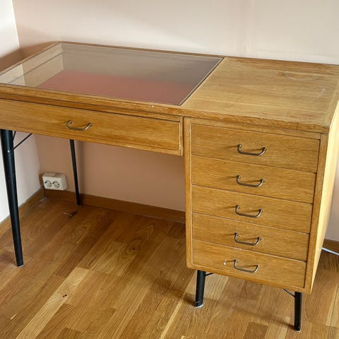 En nydelig one of a kind skrivepult med flotte detaljer. Skrivebordet er laget på bestilling til et flott kontor på 1950-tallet. Sjalusidører, skuffer og hyller i alle fasonger. Et nydelig møbel klart for mengder med balansert arbeid.