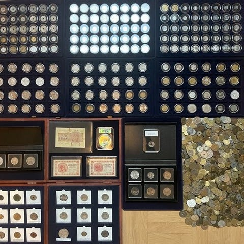 Verden. Lot de 316 monnaies du Monde dont 18 Argent, 5 kgs de vrac et 6 médailli