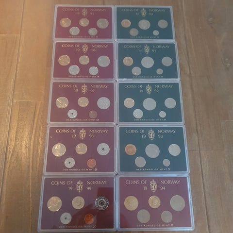 En betydelig norsk myntsamling med mynter fra 1810 til 1995, ca. 280 stykker.