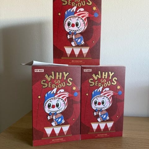 Pop Marts serie 'WHY SO SERIOUS' med vinyl plush blindboks-nkkelringer har et tema med 'merkelig klovnestil'. (Den fungerer bde som et dekorativt element og en nkkelring), og viser en klovneskikkelse, noe som gjr den til en trendy nkkelring/dekorativ gjenstand.