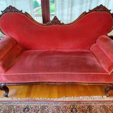 Nydelig lys rosa vintage sittegruppe i rokokko-stil. En treseter sofa og to stoler selges samlet til noen som kunne tenke seg en funky start på det nye året.