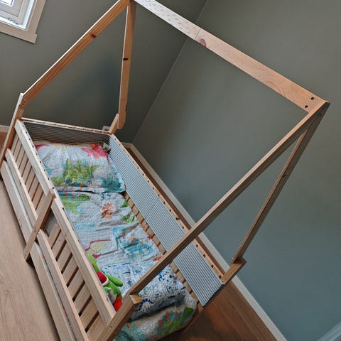 Hus-design: Denne småbarnssengen er smart designet med en ramme i husstil der du kan henge opp sengegardiner for å skape privatliv for barnet ditt.