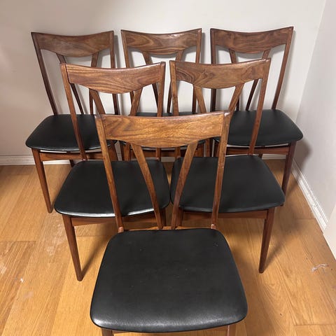 6 stoler i teak i pen, original tilstand med sorte seter i skinn. En av stolene har fått nytt skinn.