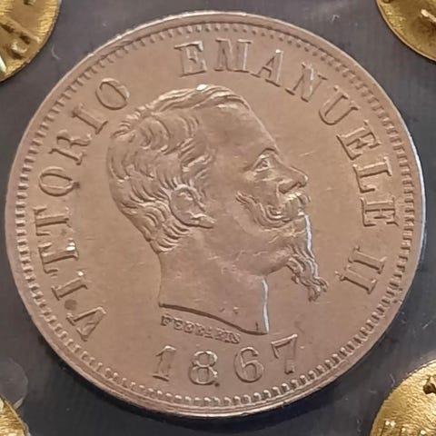 Vittorio Emanuele II - 2 lire 1861 Firenze. Ag. 2 lire 1861 Firenze, kanten har inngravert tre Fert mellom knuter og rosetter, naken hode til hyre; rundt: Vittorio Emanuele Re Eletto.