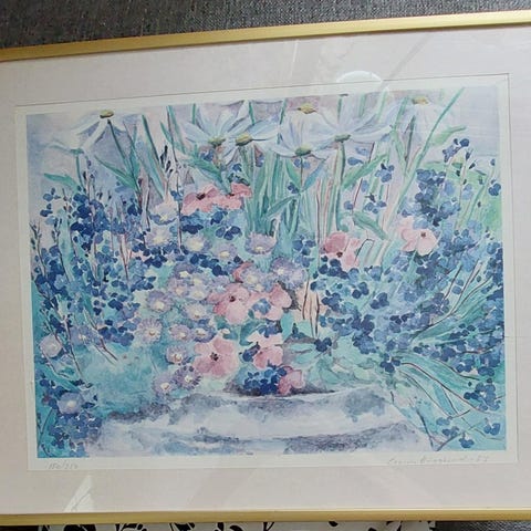 Litografi "Junibukett". 70 cm x 50 cm brutto. Plastforside.