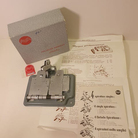 Gammelt stereoskop, merket Bruguire, produsert i Frankrike p 1940-tallet, med en vakker treskrin (21 cm x 13 cm x 20 cm) og 36 Bruguire-stereofilmer (positive p fleksibel film), fordelt p tre komplette esker med 12 stereofilmer hver (se bilder). Hele settet er i svrt god stand, tatt i betraktning dets alder (pappeskene til stereoskopet er restaurert - se bilder).