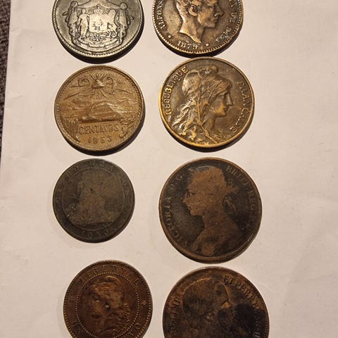 Samling av 401 mynter og samlinger fra hele verden, i ulike tilstander, mynter i slv og av numismatisk verdi, vekt p slvmynter ca. 50 gram. Alle myntene m ses p. Oppsummeringsliste: Lotto med 98 mynter i sm album, hvorav noen i slv. Tyskland - Lotto med 80 mynter i album. Storbritannia. Lotto med 48 mynter fra 1/2 penny til 50 pence, i album. Storbritannia. Lotto med 60 mynter fra 1/2 penny til minnekrone, i album. Sveits. 22 mynter, GB (44) - Lotto med 66 mynter i album. Tyskland Marco 1954.