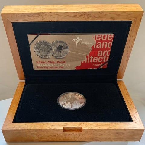 Dritto: fargelagt komposisjon av jordkloden og mnen, med rom-tidens nettverk i bakgrunnen. verst og nederst str de respektive ordene Repubblica og Italiana. Rovescio: i forgrunnen vises fotavtrykket etter astronauten Armstrong p mneoverflaten, etter landingen den 20. juli 1969, med fargerik jord som stiger opp over horisonten. verst er R, identifikasjonsmerket til Zecca di Roma; i midten str verdien 5 euro; til hyre er datoene 1969 og 2019, henholdsvis ret for mnelandingen og utgivelsesret; nederst navnet p kunstneren Momoni; og rundt kanten str setningen som astronauten uttalte rett etter landing p mnen: One small step for a man, one giant leap for mankind (Et lite steg for et menneske, et stort sprang for menneskeheten). Fotavtrykk p mnen AGF/Science Photo Library Edwin Aldrin AGF/NASA/Atlas Photo Archive.