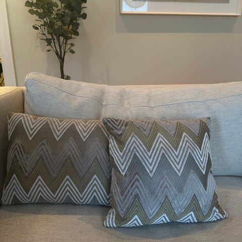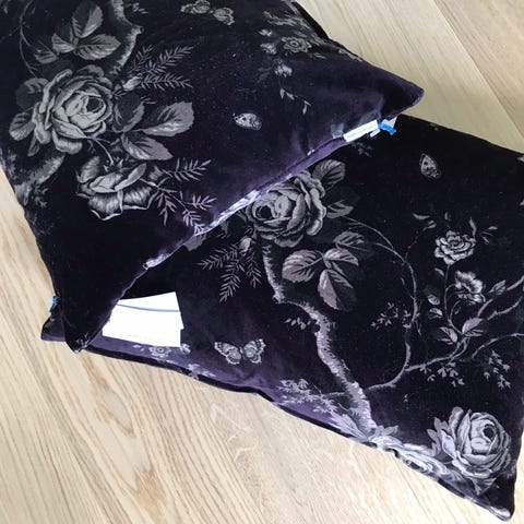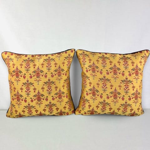 To fantastiske puter laget med ETROs verdifulle jacquard-stoff Fantasy (71 % viskose, 29 % polyester) i Multicolor med et fargerikt patchwork-mnster, med bakside i Monochrome 57 flyelsstoff i fiolett farge, en ekstra kvalitetsflyel fra Premium Collection.