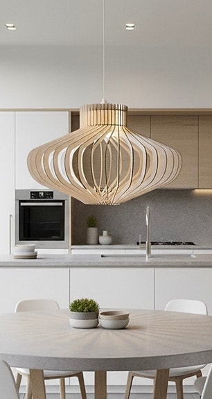 Aurora er en stor, håndlaget taklampe i tre, designet og produsert i Norge.
